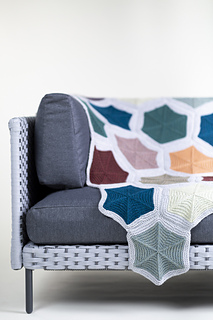 Another similar blanket project is, the “Skep Blanket” by Kate Davies available on Ravelry. This pattern is also worked square by square but has a different design than the “I Quilt Too Lap Blanket”. I love the starfish shaped pieces and the solid color connecting them together. The uneven edges, once the squares are stitched together, is a wonderful fun touch.